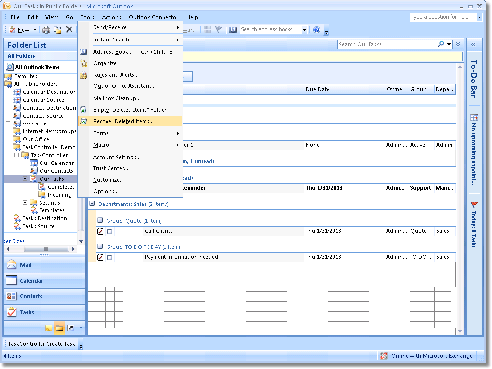 If a task is deleted from a TaskController folder and needs to be recovered, you may use Outlook's Recover Deleted Items function to retrieve it.